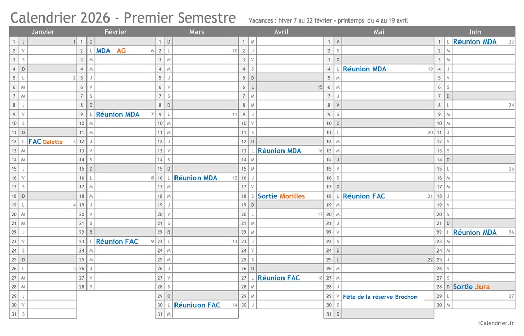 Activités***************************************************************FAC : Faculté des Sciences réunion à 18h00 -MDA : Maison des Associations réunion à 17h00Calendrier des activités du 1er semestre 2026